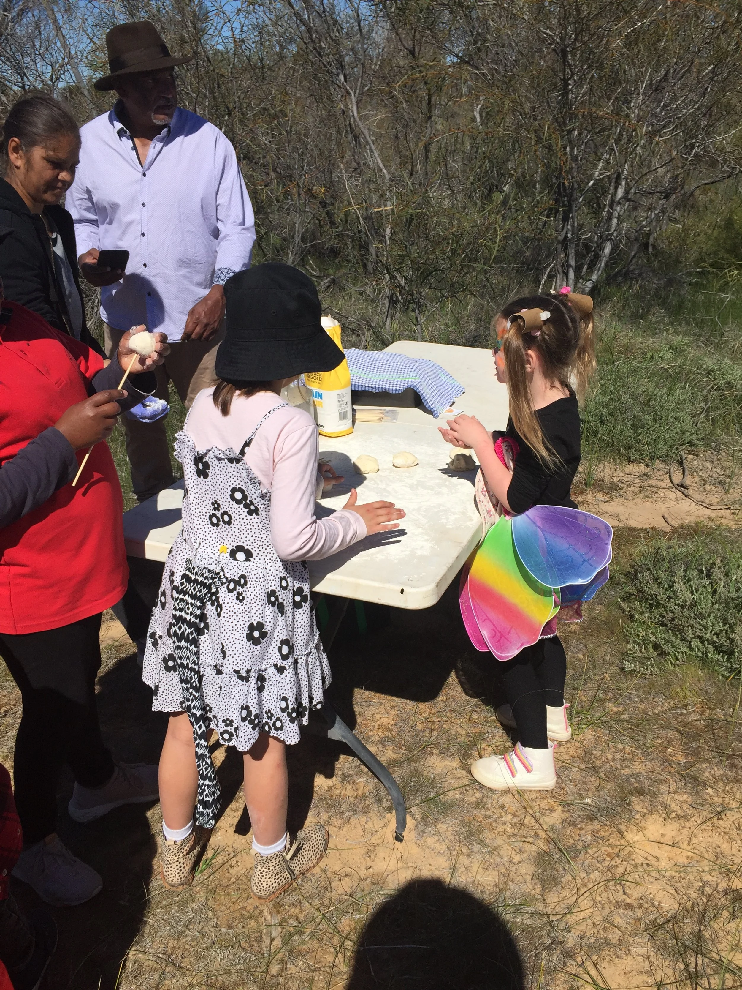Making damper. Yr 1-2 students, Quairading District High School, with the Collard family