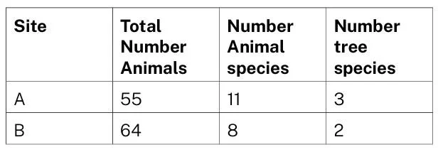 Teacher Note: In the example given, although more animals were trapped in Site B (Reserve), the number of different animal species was greater in Site A, therefore, it is the more biodiverse. This unexpected result may be explained by the extensive weed cover in Site B compared with the natural litter (home of the invertebrates) recorded in site A.