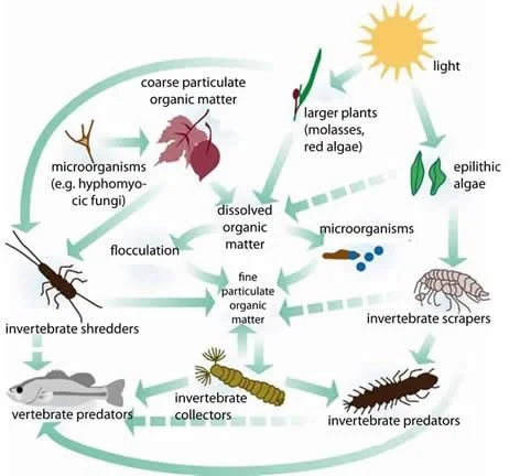 • The food supply in these waters consists of micro and macro-invertebrates, insects, crustaceans, molluscs, and worms; all are a vital part of the food chain. Together with bacteria and unicellular organisms, they help to break down leaves, bark and twigs that fall into the water, and can even change their environments by moving soil, sand, or pebbles around.