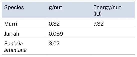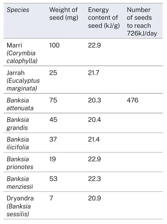 This exercise compares the energy a cockatoo can obtain from eating the seeds in a banksia nut, compared with eating the contents of a eucalypt nut. Here, we need data for the weight of seeds in each nut, see Table below.