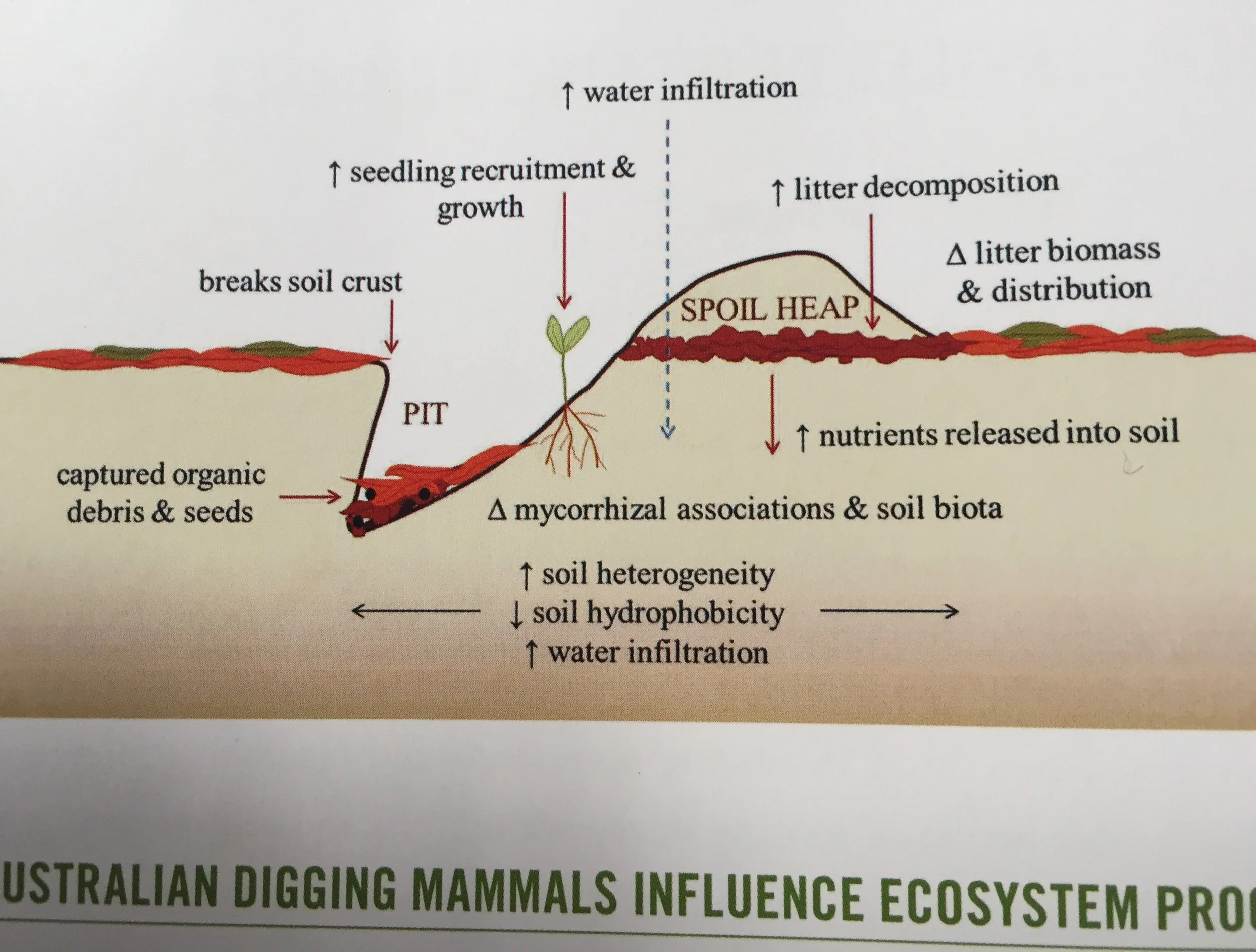 These vertebrates play an important part in the health of soils [7]. Animals that search for food (forage) in soil, use their long claws and strong forefeet to turn over plant litter and dig shallow scratchings and holes when foraging, a process called ‘turbation’. In digging, they mix organic matter into the soil and spread mycorrhizal fungi and seeds. This top soil disturbance aerates the soil, and allows water to penetrate.