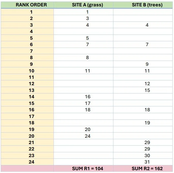 where N1 and N2 are the number of traps in each site and R1 is the sum of the ranks for Site 1.