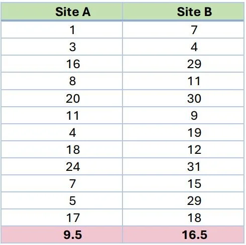 • Calculating an average, or median number for each Site, gives the median for Site A as 9.5 and 16.5 for Site B.